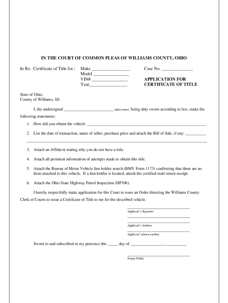 IN THE COURT OF COMMON PLEAS OF WILLIAMS COUNTY, OHIO In Re: Certificate of Title for :Make ___ Model ___ VIN# ___ Year___Case No. ___ APPLICATION FOR CERTIFICATE OF Intestate of Ohio, County of Williams,