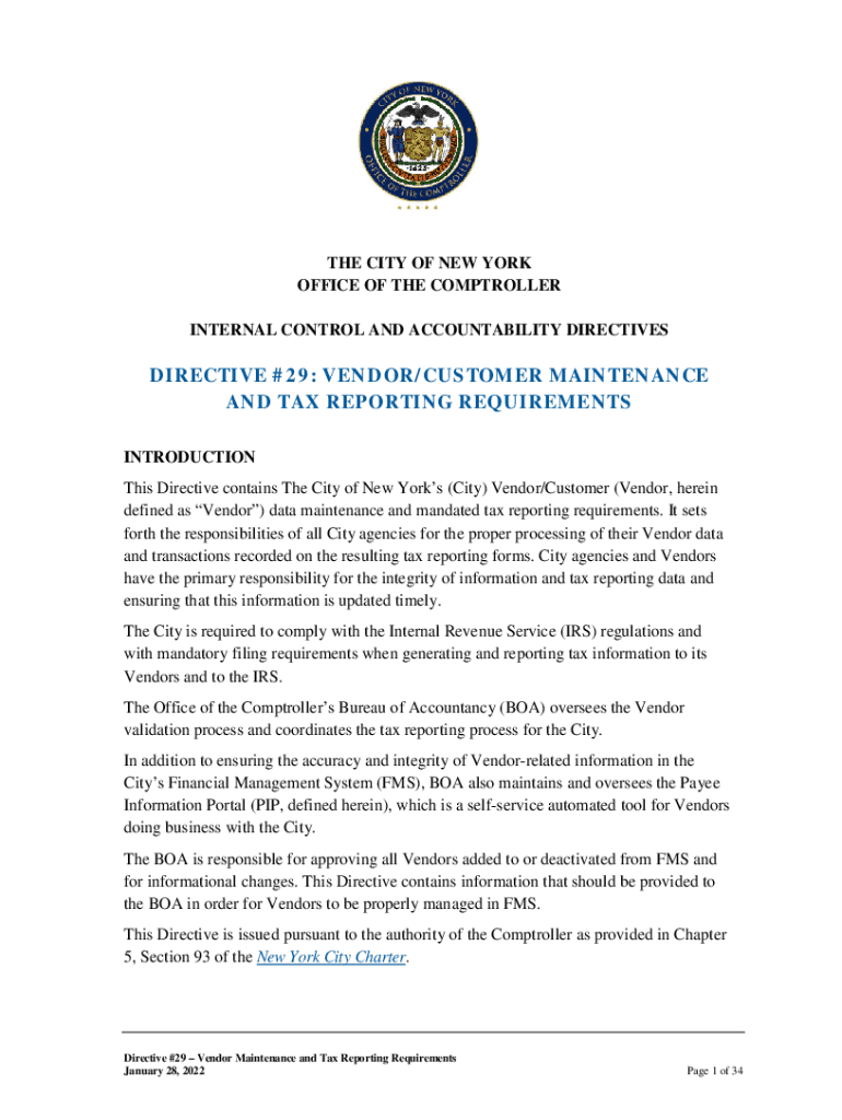 THE CITY OF NEW YORK OFFICE OF THE COMPTROLLER INTERNAL CONTROL AND ACCOUNTABILITY DIRECTIVESDIRECTIVE #29: VENDOR×CUSTOMER MAINTENANCE AND TAX REPORTING REQUIREMENTS INTRODUCTION This Directive