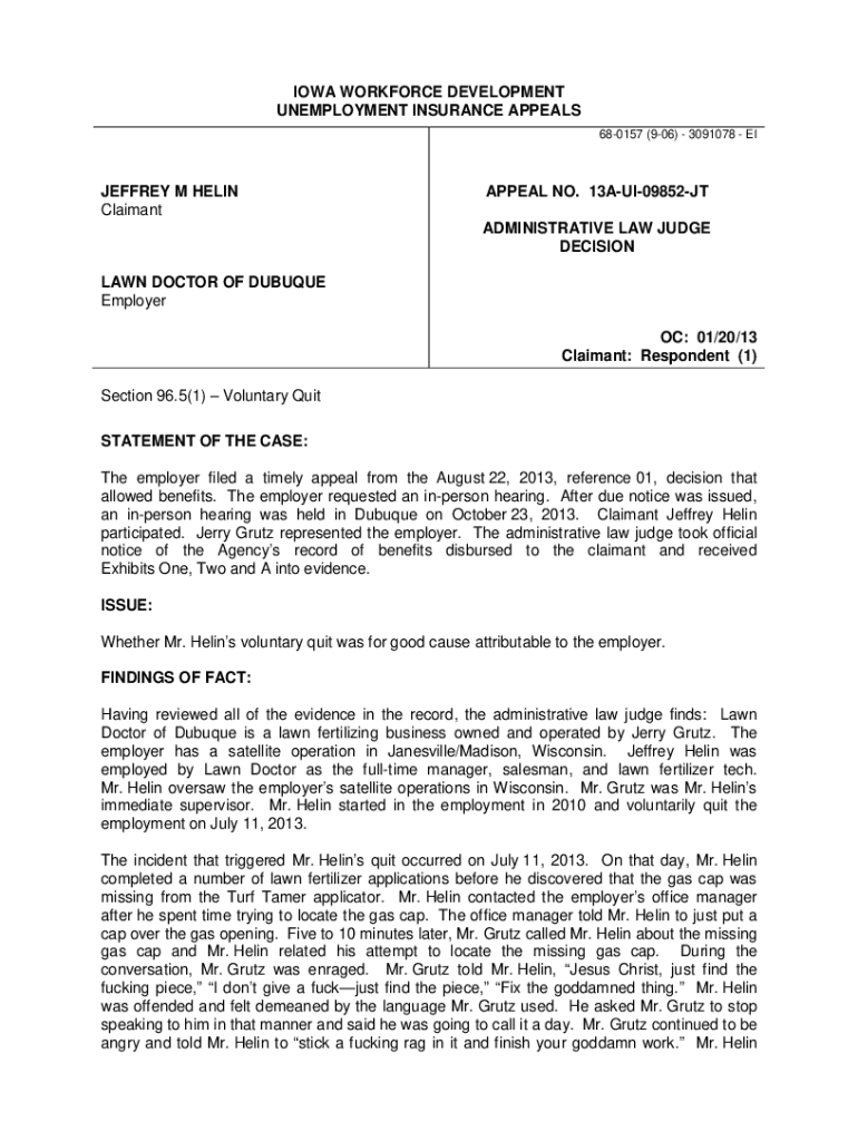 IOWA WORKFORCE DEVELOPMENT UNEMPLOYMENT INSURANCE APPEALS 680157 ×906× 3091078 JEFFREY M HELEN ClaimantAPPEAL NO. 13AUI09852JT ADMINISTRATIVE LAW JUDGE DECISION LAWN DOCTOR OF DUBUQUE Employer OC: