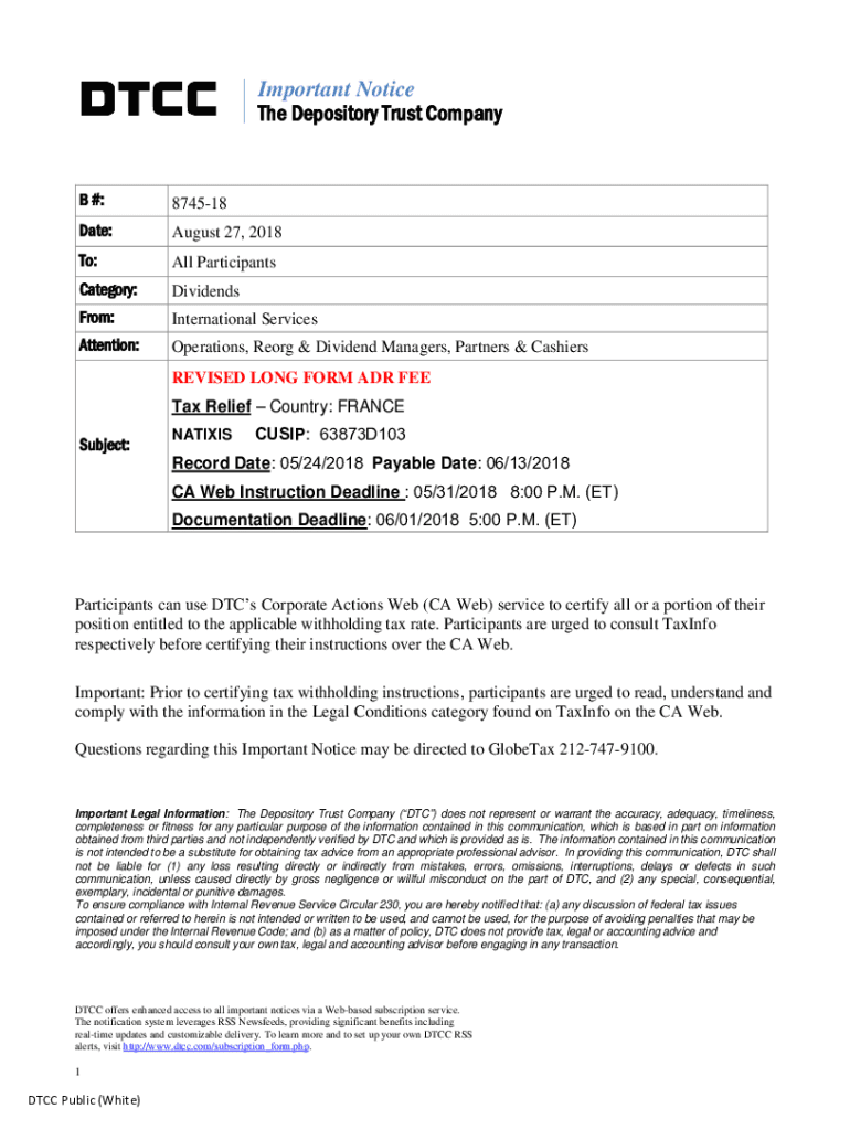 Important Notice The Depository Trust Company #:874518Date:August 27, 2018To:All ParticipantsCategory:DividendsFrom:International ServicesAttention:Operations, Reorg & Dividend Managers, Partners