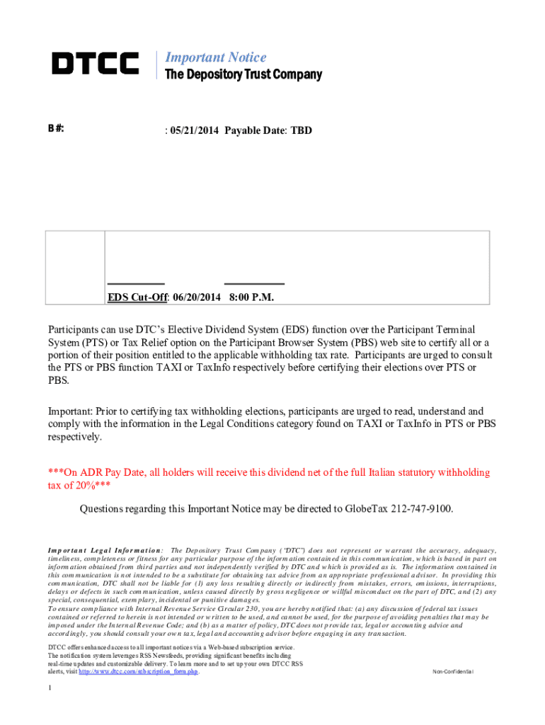 Important Notice The Depository Trust Company #:1Date:May 2, 2014To:All ParticipantsCategory:DividendsFrom:International ServicesAttention:Operations, Reorg & Dividend Managers, Partners & Cashiers
