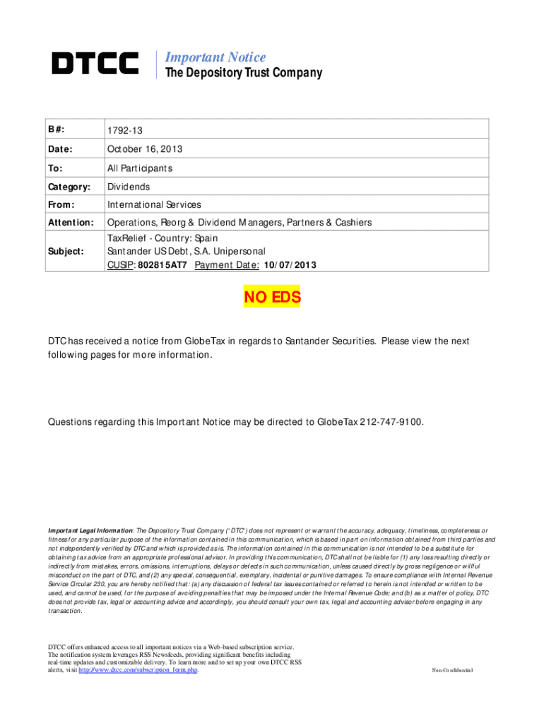 Important Notice The Depository Trust Company #:179213Date:October 16, 2013To:All ParticipantsCategory:DividendsFrom:International ServicesAttention:Operations, Reorg & Dividend Managers, Partners