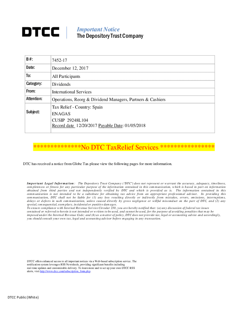 Important Notice The Depository Trust Company #:745217Date:December 12, 2017To:All ParticipantsCategory:DividendsFrom:International ServicesAttention:Operations, Reorg & Dividend Managers, Partners