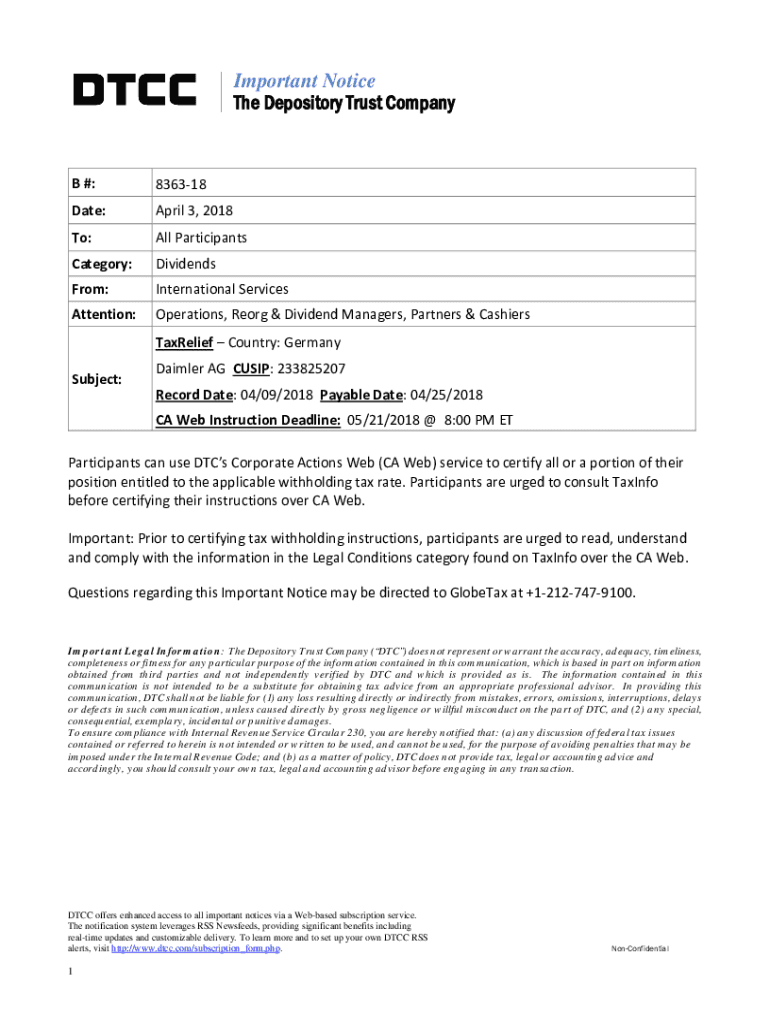 Important Notice The Depository Trust Company #:836318Date:April 3, 2018To:All ParticipantsCategory:DividendsFrom:International ServicesAttention:Operations, Reorg & Dividend Managers, Partners &