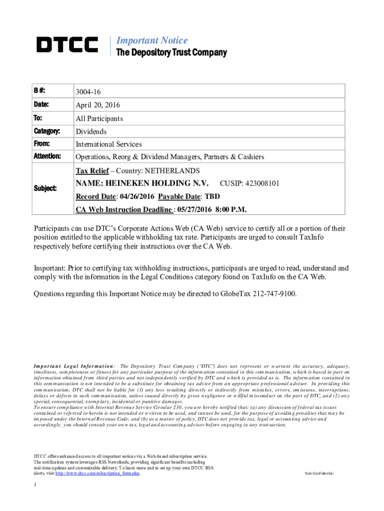 Important Notice The Depository Trust Company #:300416Date:April 20, 2016To:All ParticipantsCategory:DividendsFrom:International ServicesAttention:Operations, Reorg & Dividend Managers, Partners &
