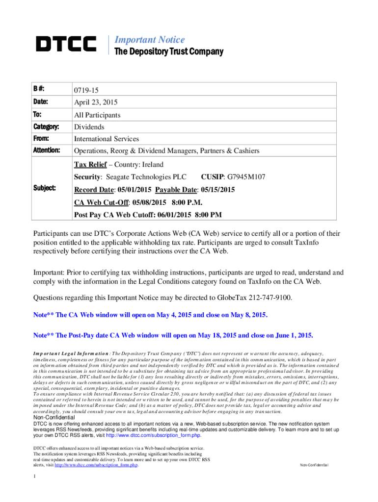 Important Notice The Depository Trust Company #:071915Date:April 23, 2015To:All ParticipantsCategory:DividendsFrom:International ServicesAttention:Operations, Reorg & Dividend Managers, Partners &