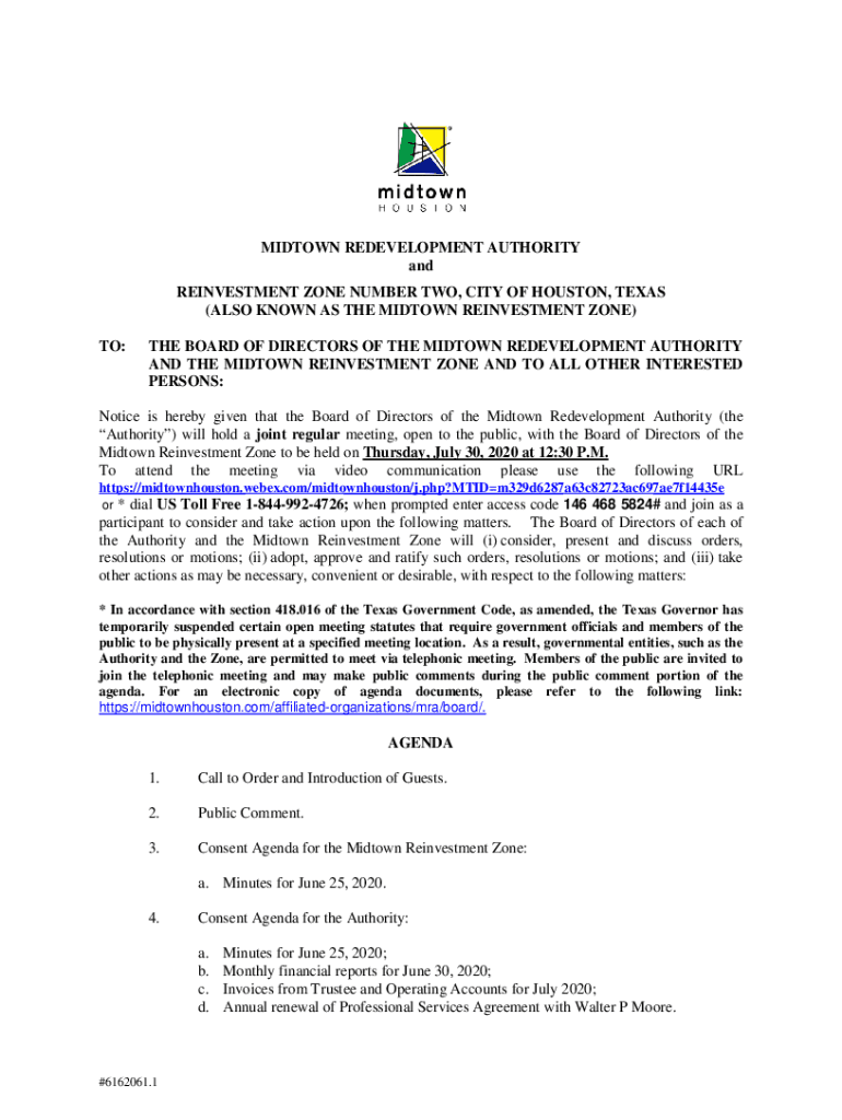 MIDTOWN REDEVELOPMENT AUTHORITY and REINVESTMENT ZONE NUMBER TWO, CITY OF HOUSTON, TEXAS (ALSO KNOWN AS THE MIDTOWN REINVESTMENT ZONE) TO:THE BOARD OF DIRECTORS OF THE MIDTOWN REDEVELOPMENT AUTHORITY