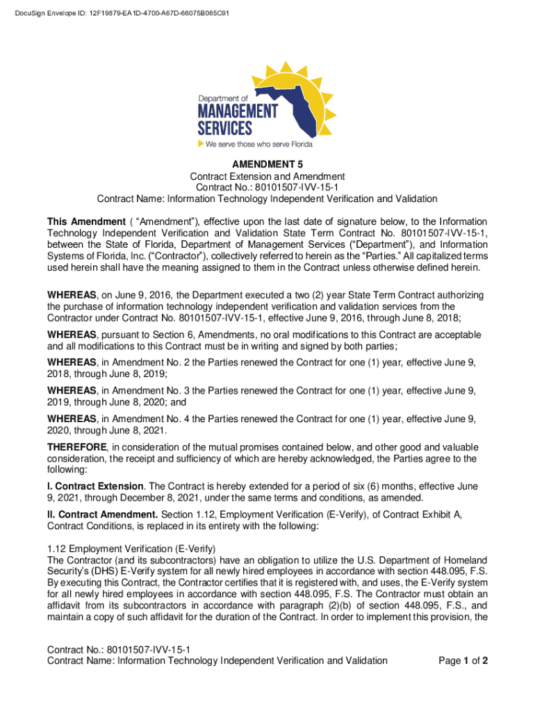 DocuSign Envelope ID: 12F19879EA1D4700A67D66075B065C91AMENDMENT 5 Contract Extension and Amendment Contract No.: 80101507IVV151 Contract Name: Information Technology Independent Verification and Validation