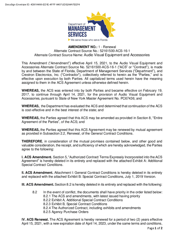 DocuSign Envelope ID: 4D81A466ED1E4FFF94072D5264A7EEF4AMENDMENT NO.: 1 Renewal Alternate Contract Source No.: 52161500ACS161 Alternate Contract Source Name: Audio Visual Equipment and Accessories