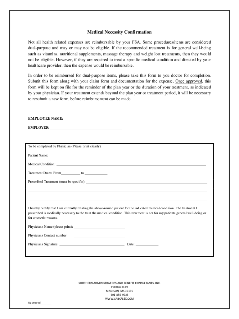 Medical Necessity Confirmation Not all health related expenses are reimbursable by your FSA. Some procedures×items are considered dual purpose and may or may not be eligible. If the recommended treatment