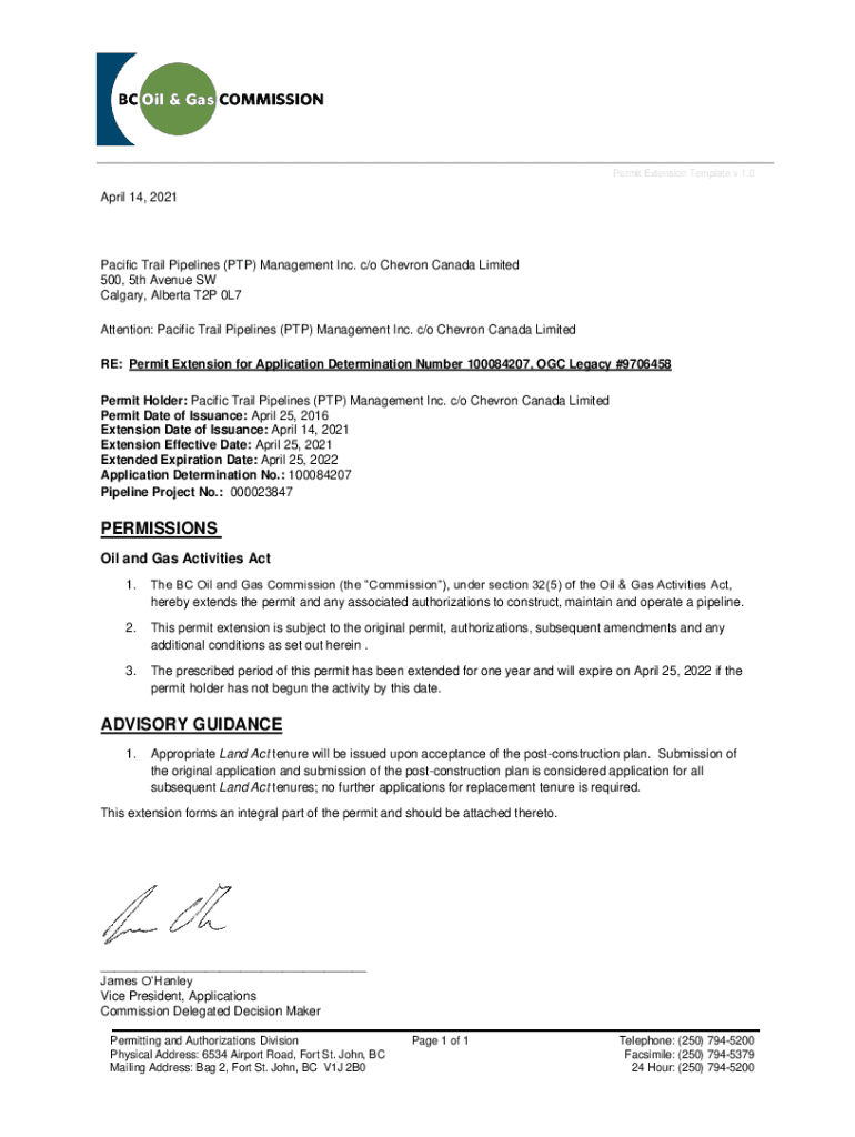 Permit Extension Template v 1.0April 14, 2021Pacific Trail Pipelines (PTP) Management Inc. c×o Chevron Canada Limited 500, 5th Avenue SW Calgary, Alberta T2P 0L7 Attention: Pacific Trail Pipelines