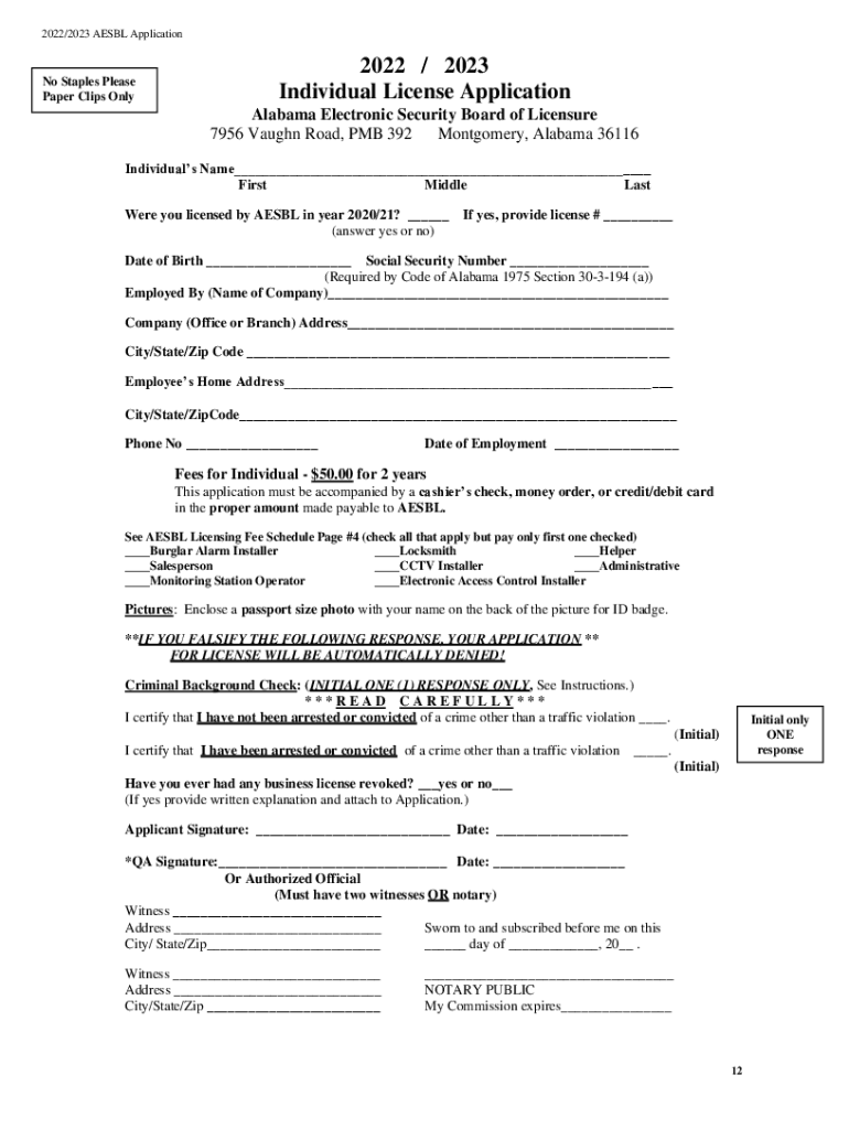 2022×2023 ASBL Application No Staples Please Paper Clips Only2022 / 2023 Individual License Application Alabama Electronic Security Board of Licensure 7956 Vaughn Road, PMB 392 Montgomery, Alabama
