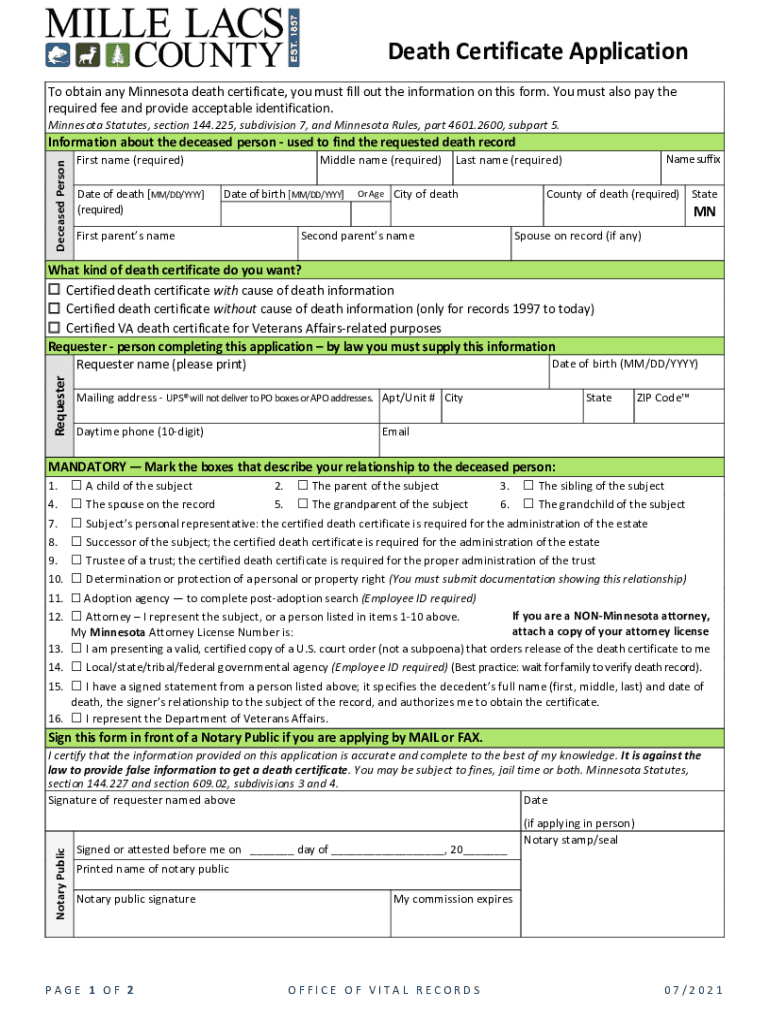 Get the free www.millelacs.mn.gov DocumentCenter ViewDeath Certificate ApplicationandInstructions...