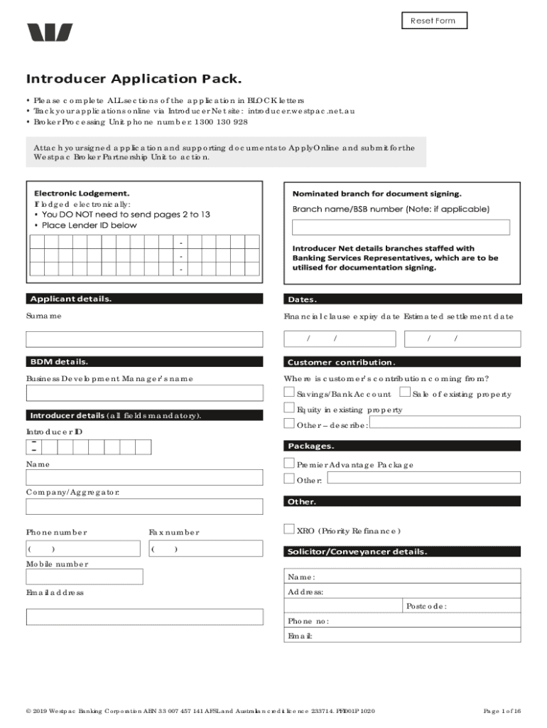 Reset FormIntroducer Application Pack. Please complete ALL sections of the application in BLOCK letters Track your applications online via Introducer Net site: introducer.Westpac.net.AU Broker Processing