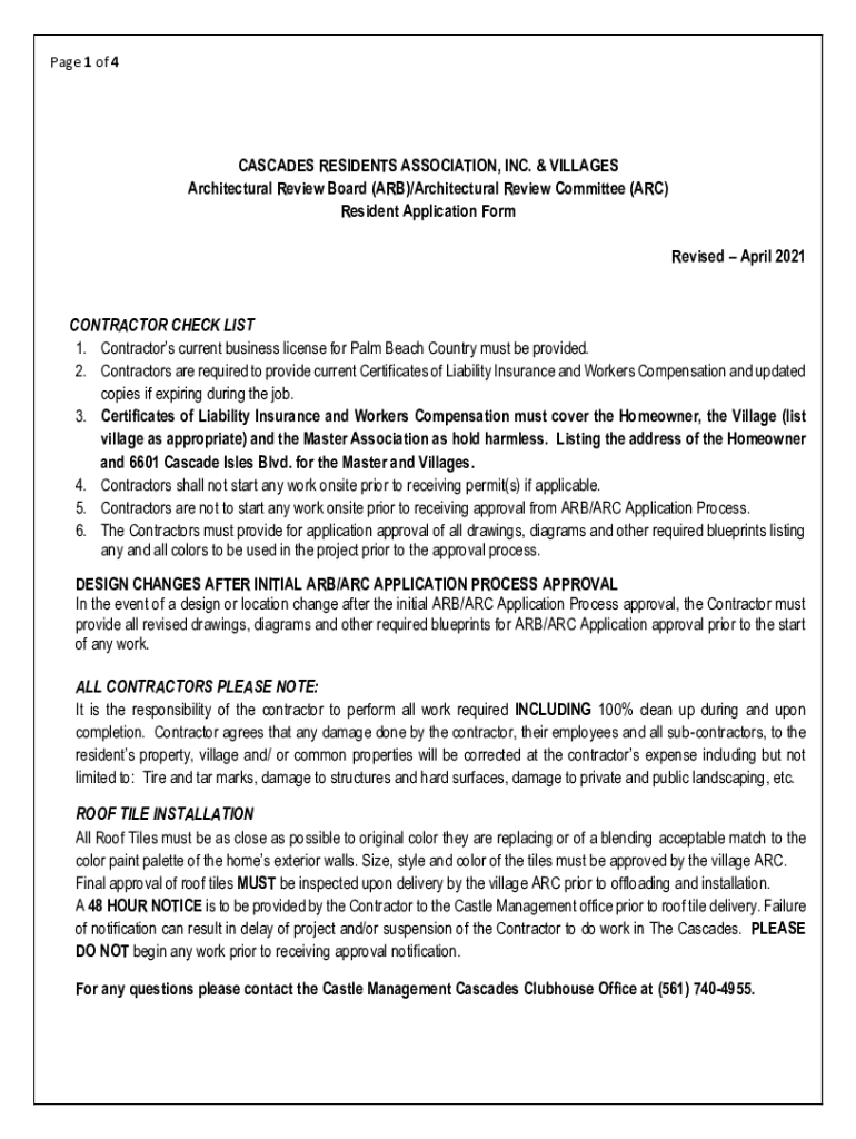 Page 1 of 4CASCADES RESIDENTS ASSOCIATION, INC. & VILLAGES Architectural Review Board (ARB)/Architectural Review Committee (ARC) Resident Application Form Revised April 2021CONTRACTOR CHECK LIST 1.