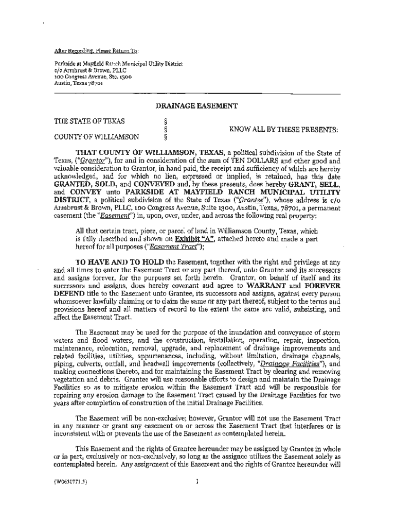 After Recording. Please Return To: Park side at Mayfield Ranch Municipal Utility District c×o Armrest & Brown, LLC 100Congress Avenue, Ste. 1300Austin, Texas 78701DRAINAGE EASEMENT THE STATE OF TEXAS