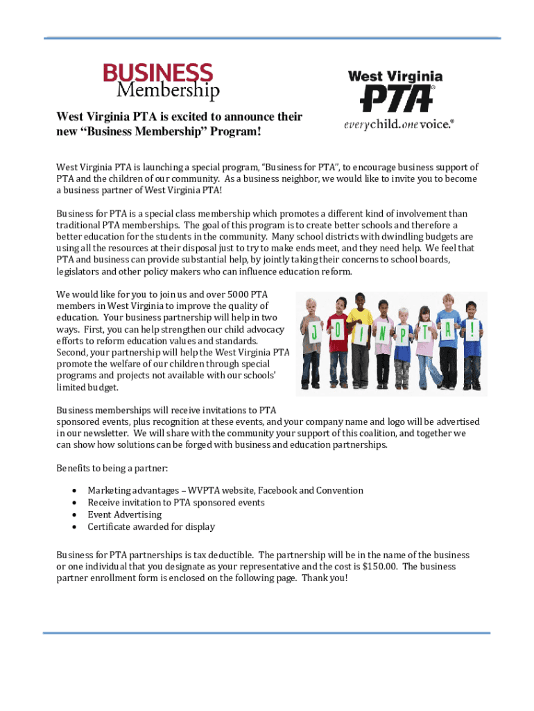 wv-pta-business-membership-applicationcheddarupcomwv pta business membership is ready when you're ready to send it out. With pdfFiller, you can send it out securely and get signatures in just a few clicks. PDFs can be sent to you by email, text message, fax, USPS mail, or notarized on your account. You can do this right from your account. Become a member right now and try it out for yourself!