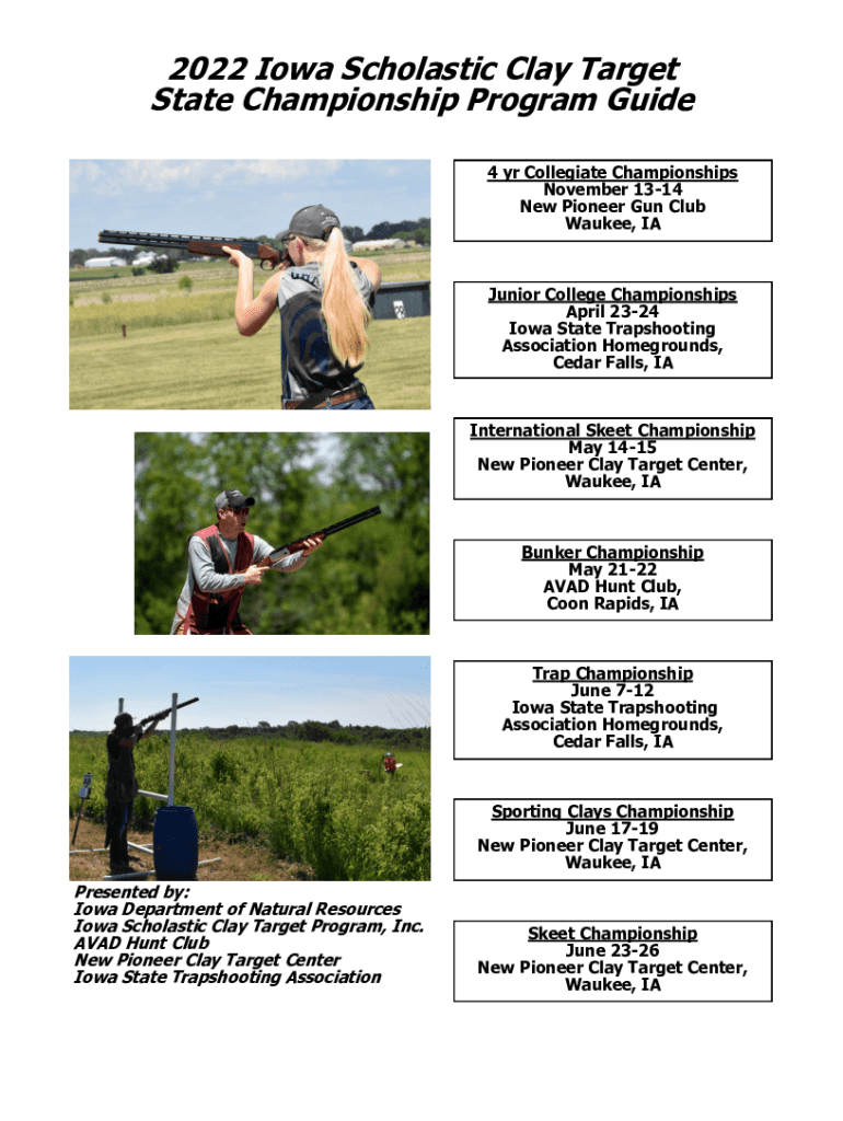 2022 Iowa Scholastic Clay Target State Championship Program Guide 4 yr Collegiate Championships November 1314 New Pioneer Gun Club Walker, IA Junior College Championships April 2324 Iowa State Trapshooting