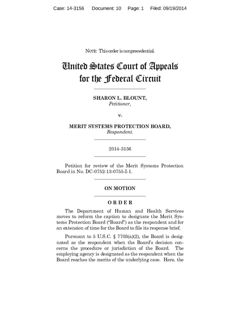 Case: 143156Document: 10Page: 1Filed: 09×19/2014NOTE: This order is nonresidential. United States Court of Appeals for the Federal Circuit ___SHARON L. BLUNT, Petitioner, v. MERIT SYSTEMS PROTECTION
