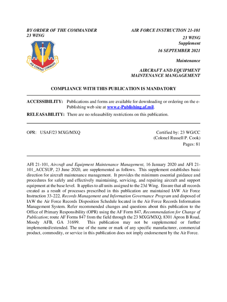 BY ORDER OF THE COMMANDER 23 WINGER FORCE INSTRUCTION 21101 23 WING Supplement 16 SEPTEMBER 2021 Maintenance AIRCRAFT AND EQUIPMENT MAINTENANCE MANGAGEMENTCOMPLIANCE WITH THIS PUBLICATION IS MANDATORY