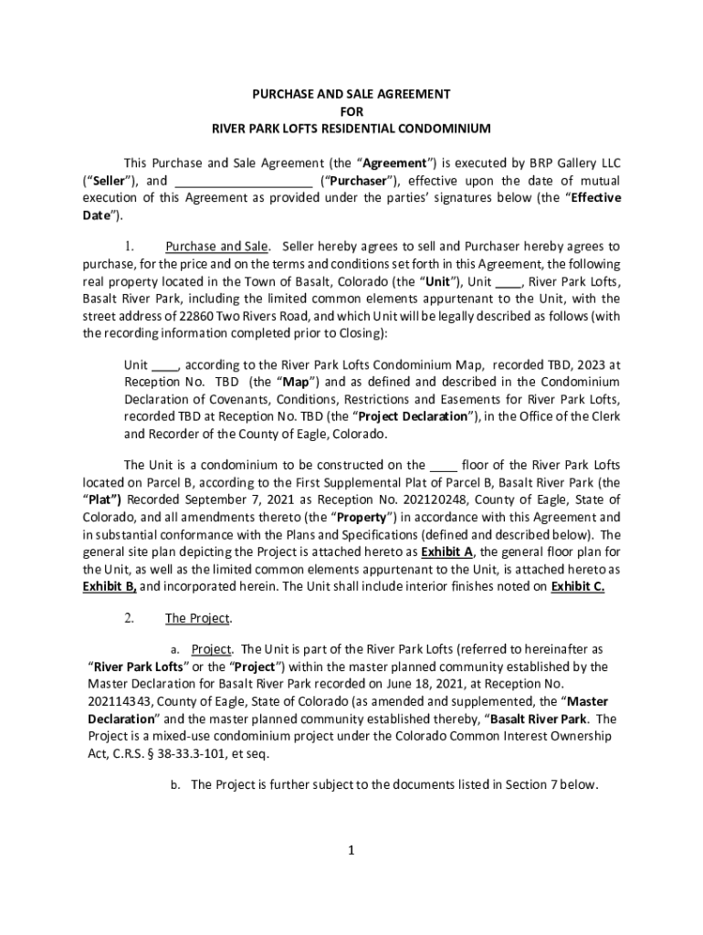 The Purchase and Sale Agreement for River Park Lofts is a legal document used by buyers and sellers to finalize the sale of a residential condominium unit in Basalt, Colorado.
