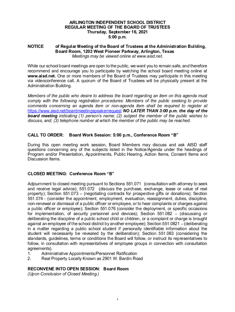 ARLINGTON INDEPENDENT SCHOOL DISTRICT REGULAR MEETING OF THE BOARD OF TRUSTEES Thursday, September 16, 2021 5:00 p.m. NOTICE of Regular Meeting of the Board of Trustees at the Administration Building,