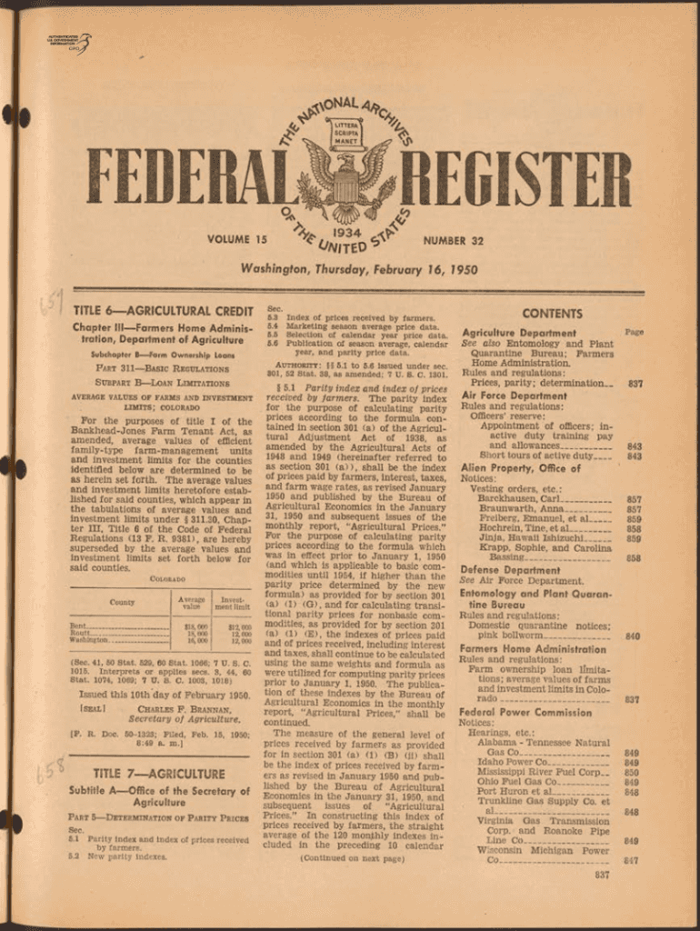 VOLUME 15× O y v f LE O ^ NUMBER 32Washington, Thursday, February 16, 1950TITLE 6 AGRICULTURAL CREDIT Chapter III Farmers Home Administration, Department of Agriculture Subchapter B Farm Ownership