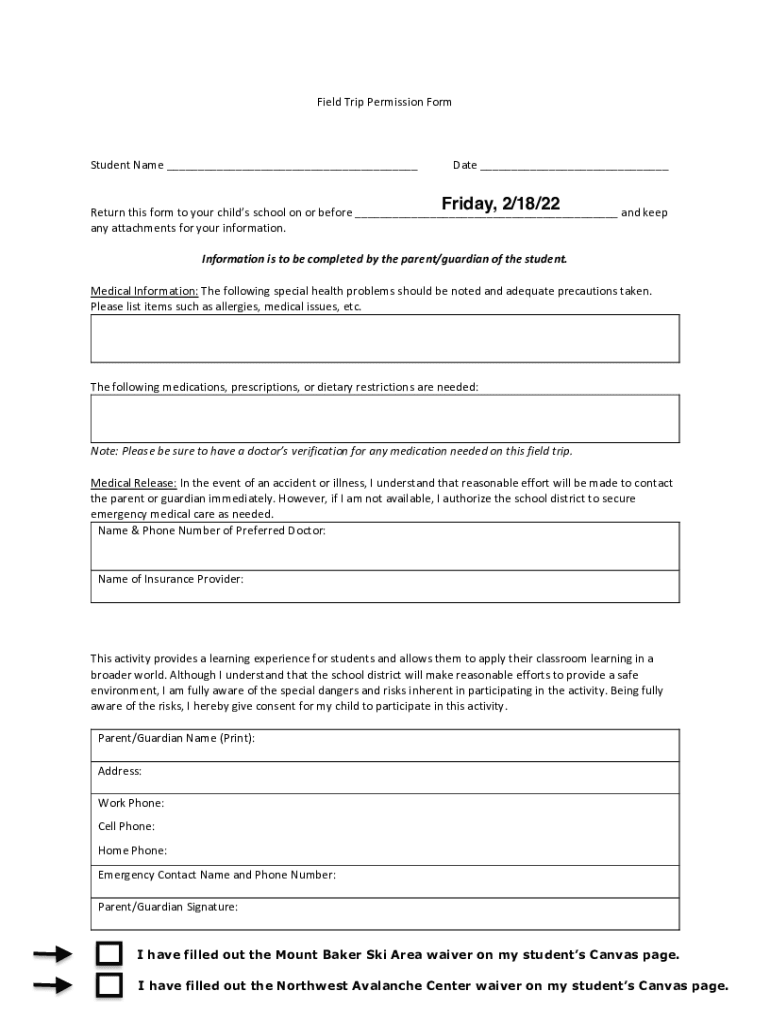 Field Trip Permission FormStudent Name ___Date ___Friday, 2×18/22 Return this form to your children school on or before ___ and keep any attachments for your information. Information is to be completed