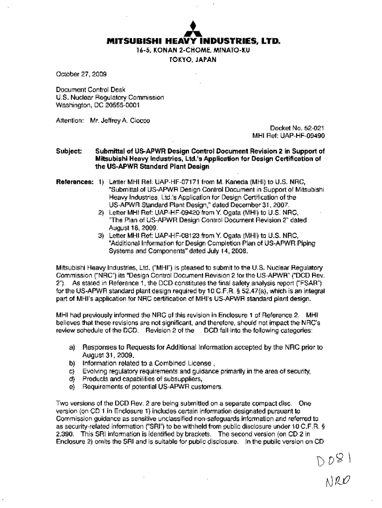 Mitsubishi HEAVY INDUSTRIES, LTD. 165, CONAN 2CHOME, MINATORY TOKYO, JAPAN October 27, 2009, Document Control Desk U.S. Nuclear Regulatory Commission Washington, DC 205550001 Attention:Mr. Jeffrey