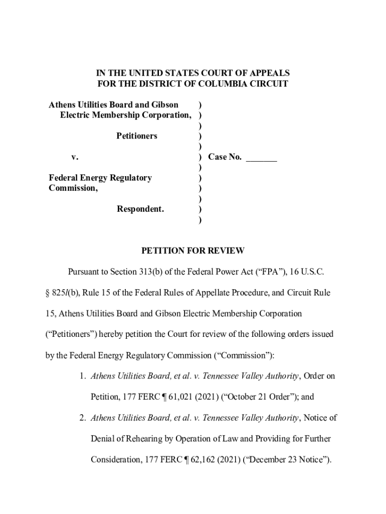 IN THE UNITED STATES COURT OF APPEALS FOR THE DISTRICT OF COLUMBIA CIRCUIT Athens Utilities Board and Gibson) Electric Membership Corporation, ) ) Petitioners)) v.) Case No. ___) Federal Energy Regulatory)