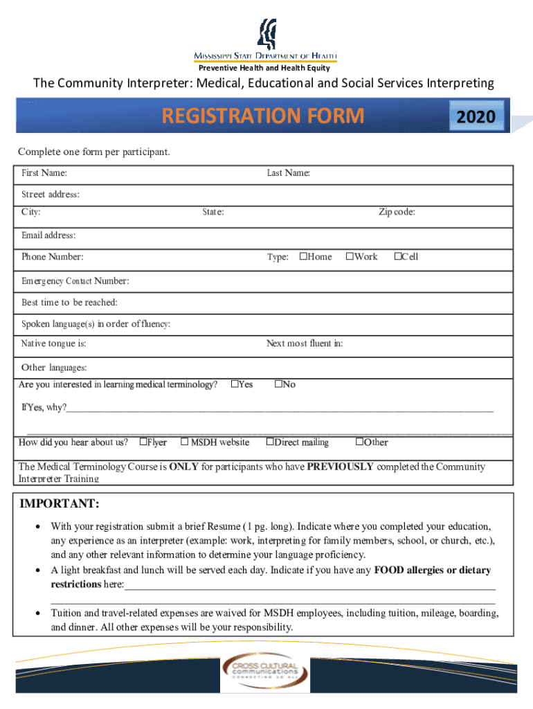 February 3, 2020, Dear Potential Trainee: The Mississippi State Department of Health Office of Preventive Health and Health Equity announce its Community Interpreter Training: Medical, Educational
