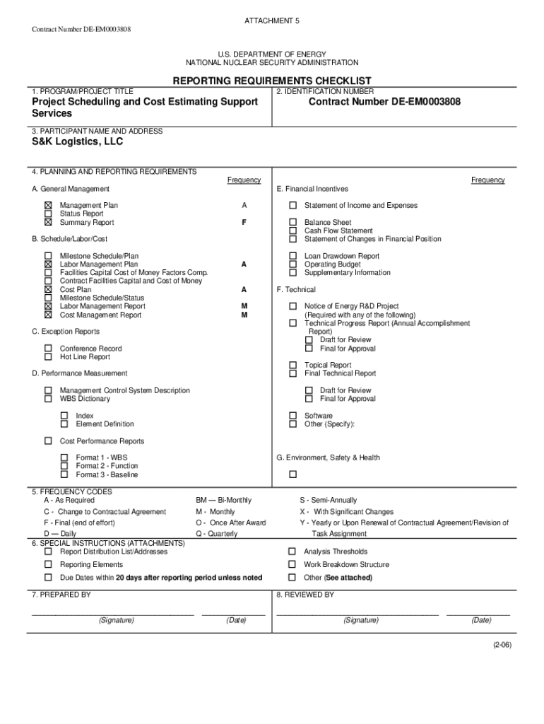ATTACHMENT 5 Contract Number DEEM0003808U. S. DEPARTMENT OF ENERGY NATIONAL NUCLEAR SECURITY ADMINISTRATIONREPORTING REQUIREMENTS CHECKLIST 1. PROGRAM×PROJECT TITLE2. IDENTIFICATION NUMBERProject