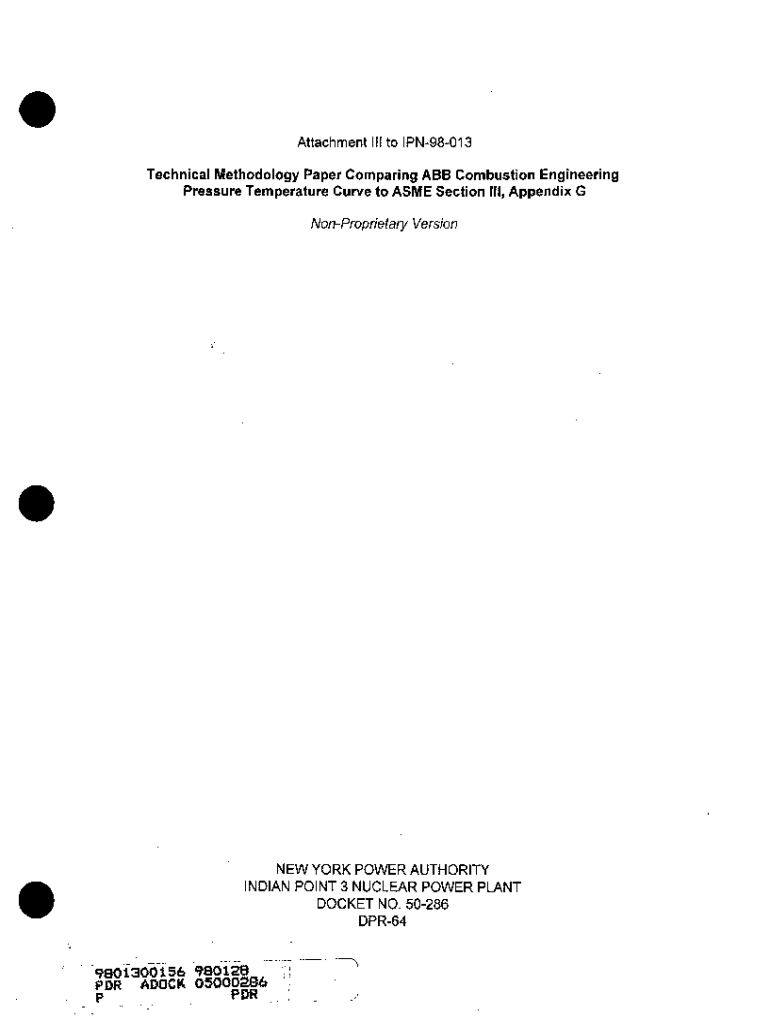 Attachment Ill to IPN98013 Technical Methodology Paper Comparing ABB Combustion Engineering Pressure Temperature Curve to ASHE Section 111, Appendix G Proprietary Versioned YORK POWER AUTHORITY INDIAN