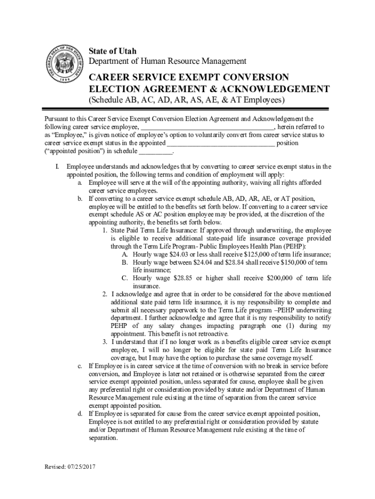 State of Utah Department of Human Resource ManagementCAREER SERVICE EXEMPT CONVERSION ELECTION AGREEMENT & ACKNOWLEDGEMENT (Schedule AB, AC, AD, AR, AS, AE, & AT Employees) Pursuant to this Career