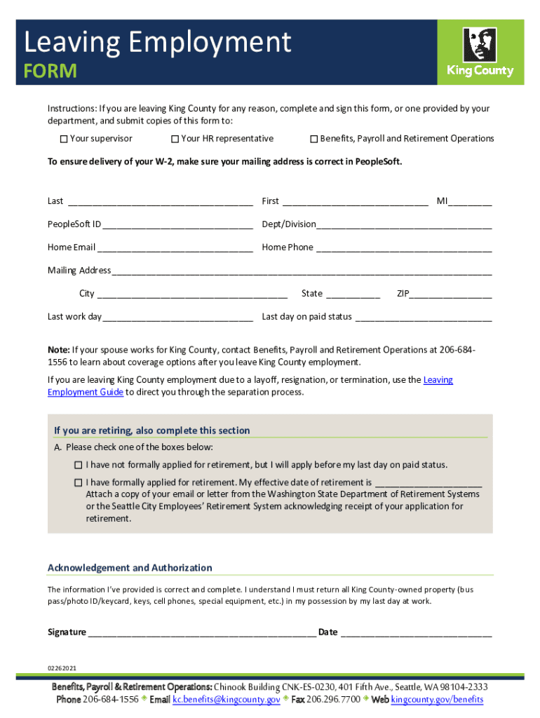 Leaving Employment FORM Instructions: If you are leaving King County for any reason, complete and sign this form, or one provided by your department, and submit copies of this form to: Your supervisory
