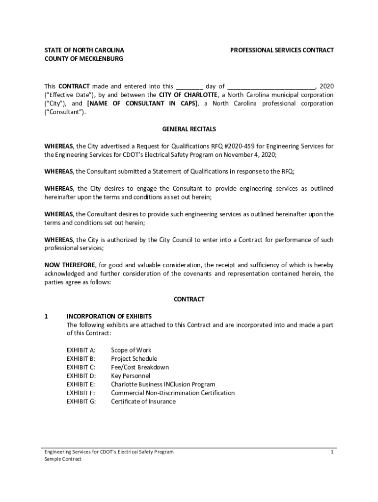 STATE OF NORTH CAROLINA COUNTY OF MECKLENBURGPROFESSIONAL SERVICES Contracts CONTRACT made and entered into this ___ day of ___, 2020 (Effective Date×, by and between the CITY OF CHARLOTTE, a North