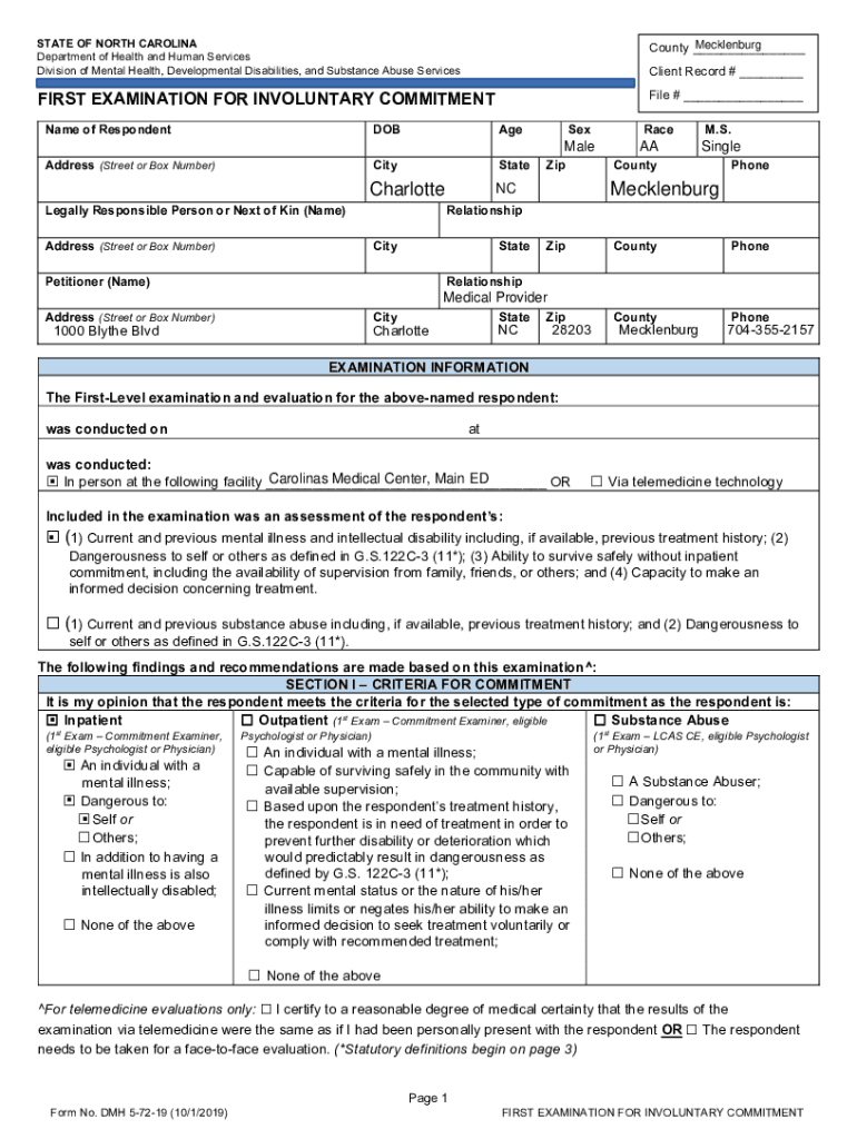 STATE OF NORTH CAROLINA Department of Health and Human Services Division of Mental Health, Developmental Disabilities, and Substance Abuse ServicesMecklenburg County ___FIRST EXAMINATION FOR INVOLUNTARY