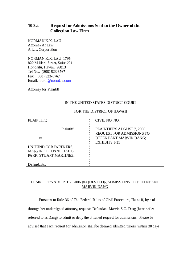 10.3.4Request for Admissions Sent to the Owner of the Collection Law Firewoman K.K. LAU Attorney At Law A Law Corporation NORMAN K.K. LAU 1795 820 Militant Street, Suite 701 Honolulu, Hawaii 96813