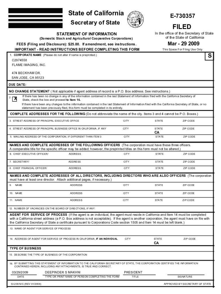 State of CaliforniaE730357Secretary of StateFILEDSTATEMENT OF INFORMATION (Domestic Stock and Agricultural Cooperative Corporations×In the office of the Secretary of State of the State of California