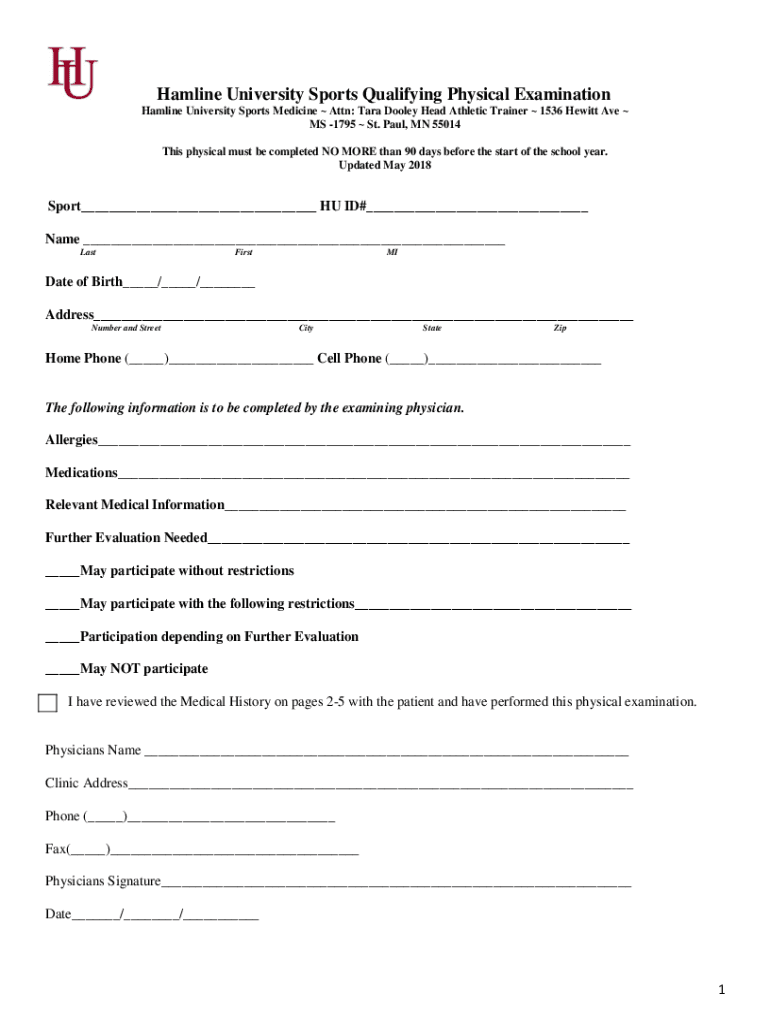 Hamlin University Sports Qualifying Physical Examination Hamlin University Sports Medicine Attn: Tara Dooley Head Athletic Trainer 1536 Hewitt Ave MS 1795 St. Paul, MN 55014 This physical must be