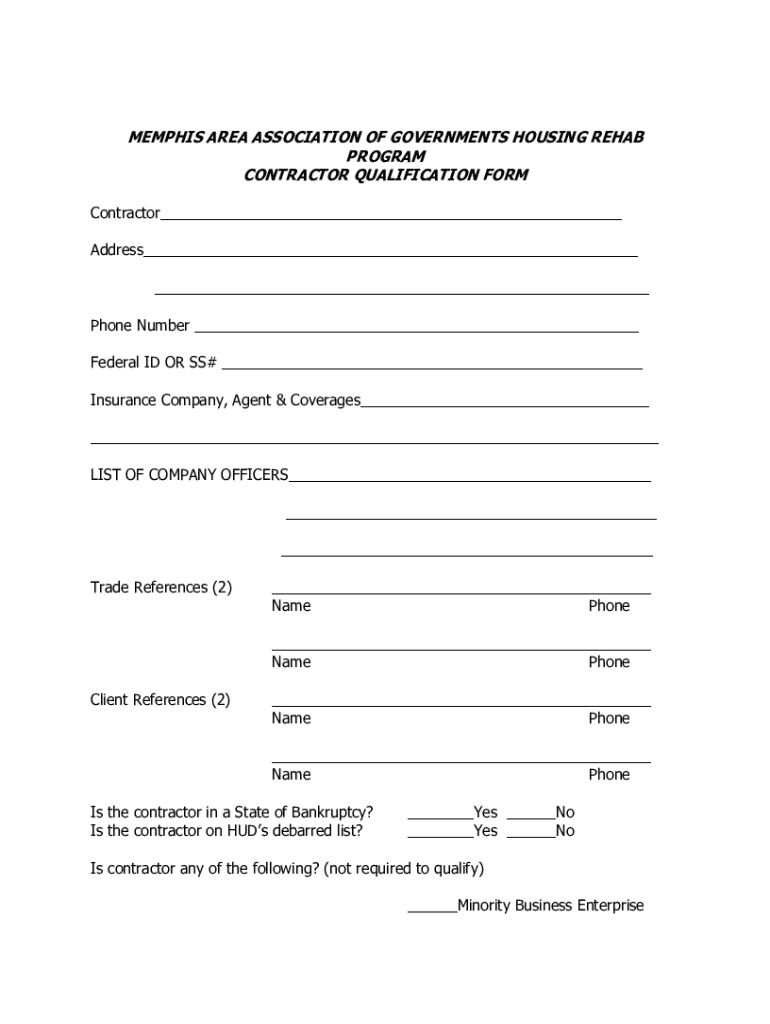 MEMPHIS AREA ASSOCIATION OF GOVERNMENTS HOUSING REHAB PROGRAM CONTRACTOR QUALIFICATION FORM Contractor___ Address___ ___ Phone Number ___ Federal ID OR SS# ___ Insurance Company, Agent & Coverages___