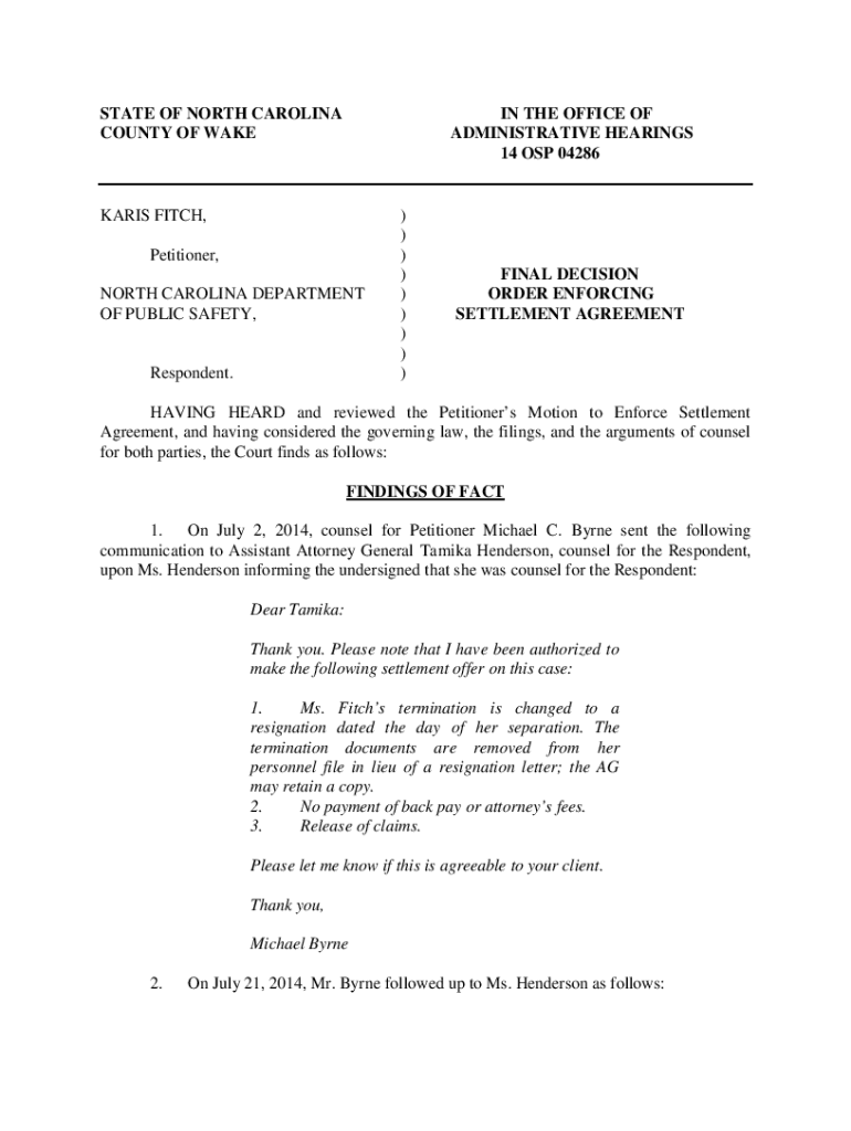 STATE OF NORTH CAROLINA COUNTY OF WAKEN THE OFFICE OF ADMINISTRATIVE HEARINGS 14 DSP 04286KARIS FITCH, Petitioner, NORTH CAROLINA DEPARTMENT OF PUBLIC SAFETY, Respondent.) ))))))))FINAL DECISION ORDER