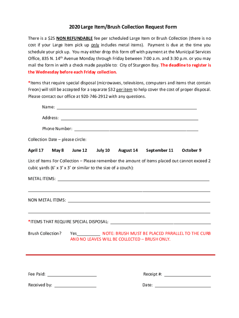 2020 Large Item×Brush Collection Request Form There is a ×25 NON-REFUNDABLE fee per scheduled Large Item or Brush Collection (there is no cost if your Large Item pick up only includes metal items×.