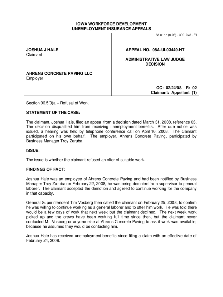 IOWA WORKFORCE DEVELOPMENT UNEMPLOYMENT INSURANCE APPEALS 680157 ×906× 3091078 JOSHUA J HALE ClaimantAPPEAL NO. 08AUI03449HT ADMINISTRATIVE LAW JUDGE DECISIONAHRENS CONCRETE PAVING LLC Employer