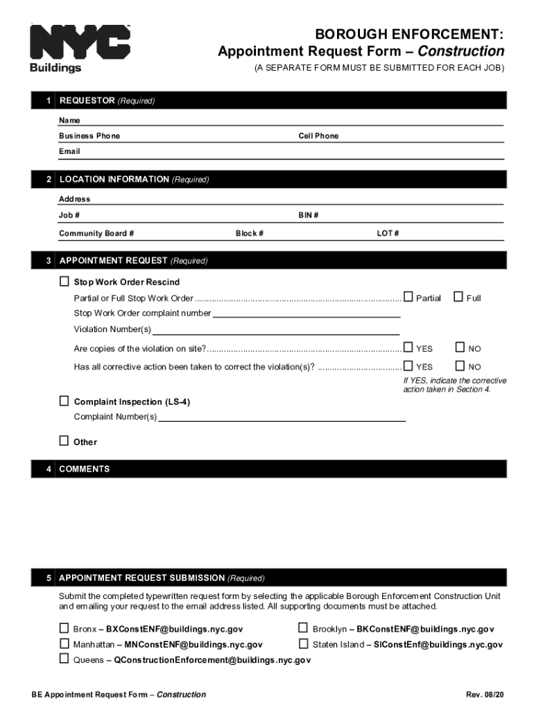 , BOROUGH ENFORCEMENT: Appointment Request Form Construction (A SEPARATE FORM MUST BE SUBMITTED FOR EACH JOB×1 REQUESTOR (Required) Name Business Photocell PhoneEmail2 LOCATION INFORMATION (Required)