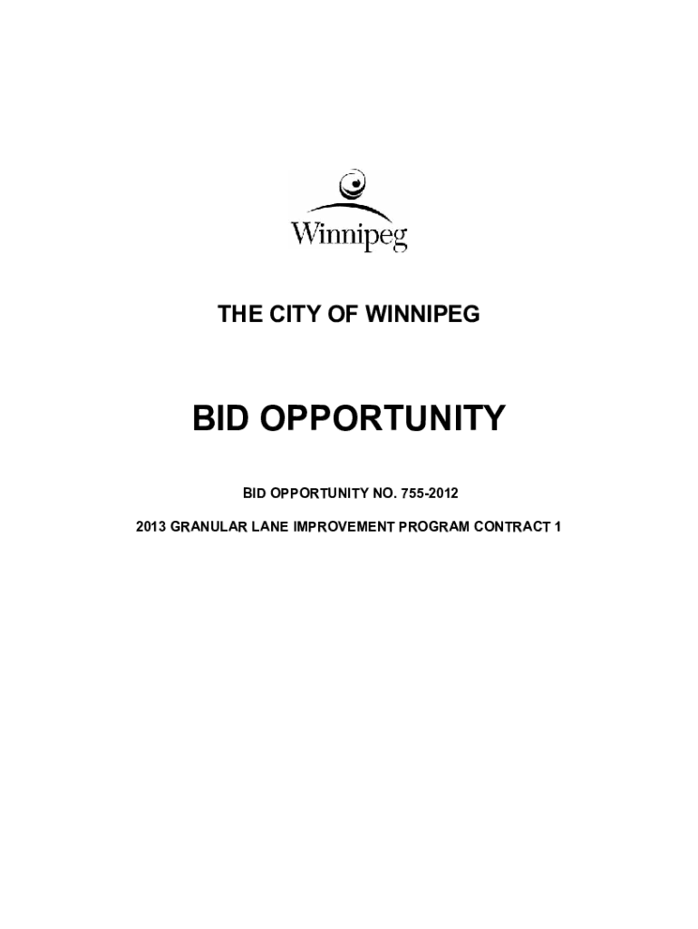 THE CITY OF WINNIPEG OPPORTUNITY BID OPPORTUNITY NO. 7552012 2013 GRANULAR LANE IMPROVEMENT PROGRAM CONTRACT 1The City of Winnipeg Bid Opportunity No. 7552012Table of ContentsTemplate Version: C420120419
