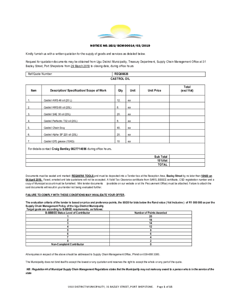 NOTICE NO.UGU×SCM00014×03×2019 Kindly furnish us with a written quotation for the supply of goods and services as detailed below. Request for quotation documents may be obtained from UGU District