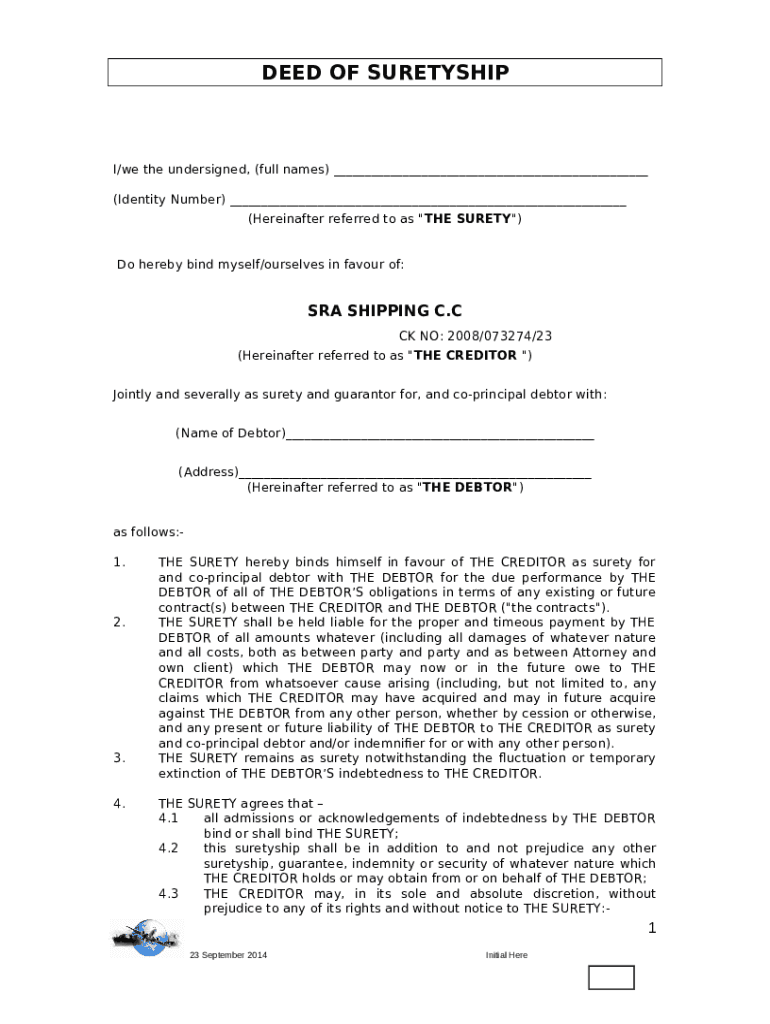 The uberoptical.comdocumentsDEED-OF-SURETY-0315DEED OF SURETY ENTERED INTO AND BETWEEN Identity Number AND ... is a document that has to be filled-out and signed for specified purposes. Then, it is provided to the actual addressee in order to provide specific info of certain kinds. The completion and signing is able manually or via an appropriate solution e. g. PDFfiller. These services help to submit any PDF or Word file without printing out. It also allows you to customize it according to the needs you have and put legit e-signature. Once you're good, the user ought to send the uberoptical.comdocumentsDEED-OF-SURETY-0315DEED OF SURETY ENTERED INTO AND BETWEEN Identity Number AND ... to the respective recipient or several of them by mail or fax. PDFfiller provides a feature and options that make your blank printable. It provides different options when printing out. It doesn't matter how you deliver a document - in hard copy or electronically - it will always look well-designed and firm. In order not to create a new writable document from scratch every time, turn the original form into a template. After that, you will have an editable sample.