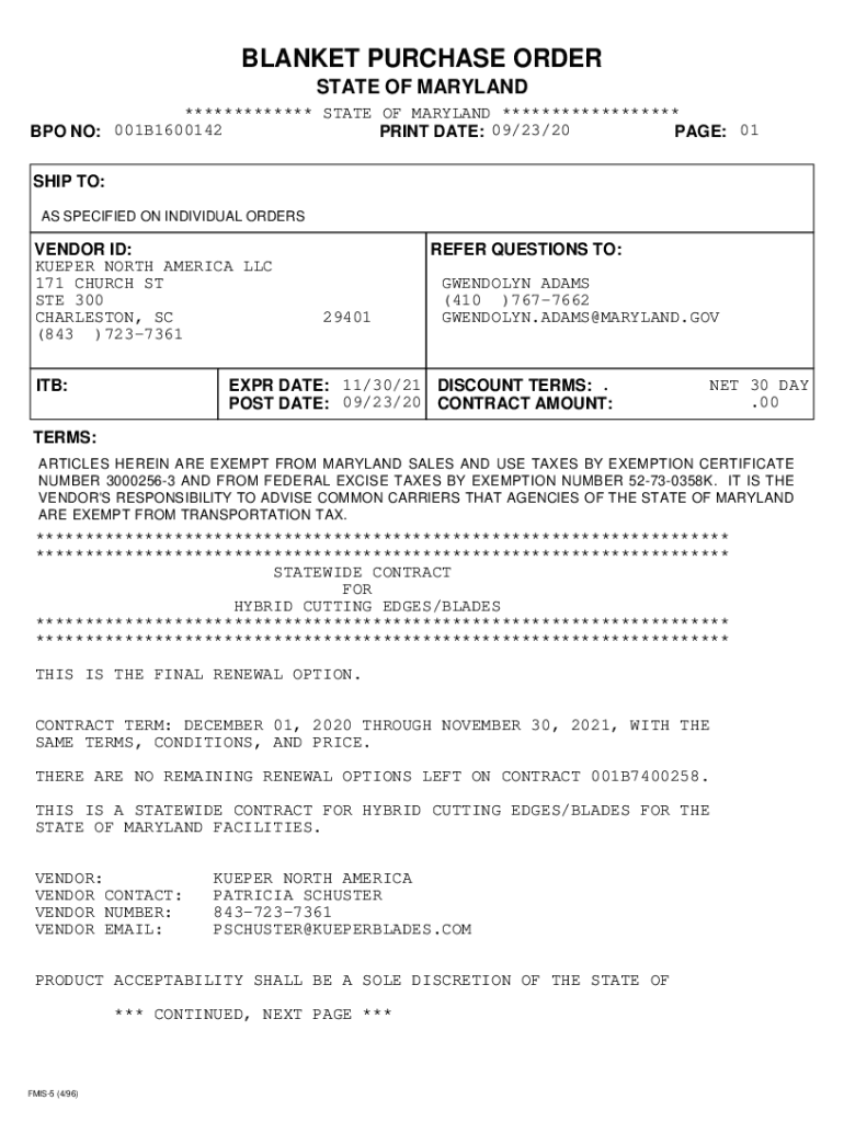 BLANKET PURCHASE ORDER STATE OF MARYLAND ************* STATE OF MARYLAND ****************** 001B1600142 BPO NO: PRINT DATE: 09×23/20 PAGE: 01 SHIP TO: AS SPECIFIED ON INDIVIDUAL ORDERSVENDOR ID: