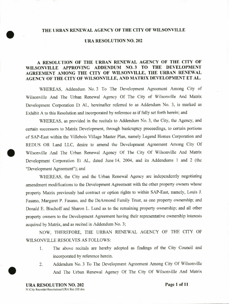 THE URBAN RENEWAL AGENCY OF THE CITY OF WILSONVILLE URA RESOLUTION NO. 202A RESOLUTION OF THE URBAN RENEWAL AGENCY OF THE CITY OF WILSONVILLE APPROVING ADDENDUM NO. 3 TO THE DEVELOPMENT AGREEMENT